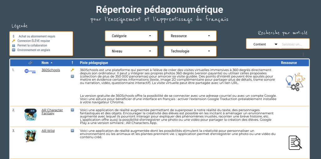 Le Service National du RÉCIT du domaine des langues a édité un site où est colligé une multitude d’outils technologiques, souvent accompagnés de pistes pédagogiques.